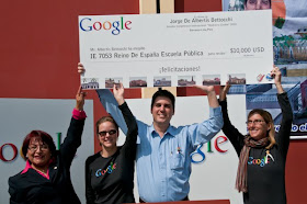 1. As part of the winning prize, Google gave a donation to a public school of Jorge’s choice. Jorge talked to the students and staff at a ceremony in the school’s courtyard, and we presented a large check to IE 7053 Reino De Espana Public School. Googlers helped students with a hands-on paper 3D modeling project, where they constructed models of the buildings Jorge submitted for the competition. The school graciously hosted a celebration for Jorge and Google, which included a welcome by student marching bands, traditional Peruvian dances, ballerinas, theater acts, singing, and a poetry jam.